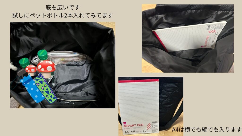 ●お弁当や水筒、ペットボトルも余裕の収納力(お弁当+ペットボトル2本入れてみても余裕でした)→子供の水筒と自分の飲み物も入る