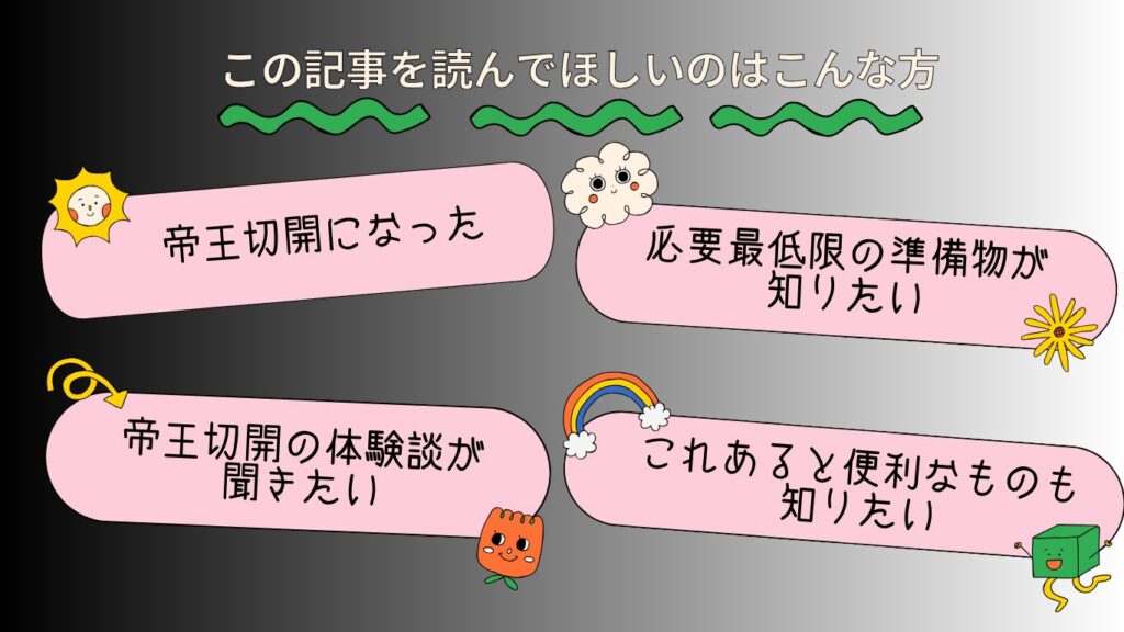 | 21時以降 絶飲食 検査や入院・手術後の説明などを受けます | 絶飲食(夜から水分のみ可) 朝から点滴が始まり、背中側から麻酔をします。 手術後は点滴をしながらベッドで過ごす(痛みとの闘い) | 朝から全粥 お昼は普通食 (本来はこの日から尿の管をとり、病室での授乳開始・歩行後シャワーも可能でしたが、出血のためできず) | 普通食 ここから3日間は授乳などの援助や指導をしてもらいながら、体調回復もしつつ、赤ちゃんと過ごす時間の練習をします(さっさママはこの日に尿の管をとり、ようやく歩行開始。近い距離でも歩くのに、とても時間がかかる状態でした) | さっさママは通常の流れより遅れて授乳開始。歩行もようやくできるように | 検査 授乳室で授乳開始 退院指導など | 退院日 母子手帳返却 午前中には 退院 退院服(授乳できる私服)に着替える 支払い済ます (場所にもよると思いますが、前日には金額を教えてもらえました) |