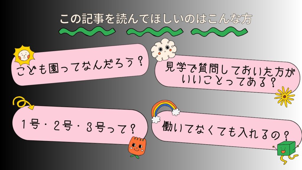 この記事では、保育園・幼稚園・こども園の違いを簡単にまとめ、こども園を選んだ私が実体験をもとにして「見学や説明会で聞いておきたい質問」・「さっさママは何を重視したのかなどの体験談」も踏まえてご紹介します。